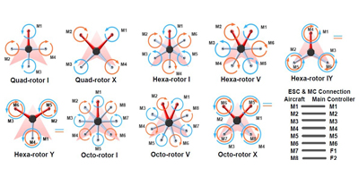 Octo X, Octo I, Octo V; (Naza-M V2 non supporta il velivolo che ha grandi vibrazioni, in modo che quando si sceglie di utilizzare hexa-rotore o octo-rotore, si prega di prestare attenzione alla situazione delle vibrazioni e cercare di fare un po’ di smorzamento delle stesse).