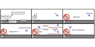 Se il radiocomando supporta fail-safe, è possibile impostare la modalità fail-safe sul "canale U". La centralina di controllo Naza offre anche la modalità di sicurezza (FAIL-SAFE) automatica, il che significa che quando la comunicazione tra il radiocomando e la ricevente è scollegata, il multirotore si riposiziona in volo stazionario livellato. Se si utilizza il modulo GPS, è anche possibile impostare la funzione RTH (torna a casa) permettendo al multirotore di tornare automaticamente sul punto di partenza.