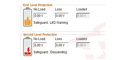 Al fine di evitare che il multi-rotore possa subire conseguenze dannose causate dalla bassa tensione della batteria, abbiamo progettato due livelli di protezione. È possibile scegliere di non utilizzare questo sistema di protezione, ma si consiglia vivamente l’utilizzo. Entrambi i livelli di protezione, utilizzano una luce LED per avvertire il pilota. Durante la prima fase di protezione lampeggia continuamente un LED rosso di avvertimento, durante la seconda fase di protezione lampeggerà il LED rosso e successivamente il multi-rotore comincerà a scendere di quota fino ad atterrare. In modalità manuale, quando la protezione di bassa tensione viene attivata, solo l’allarme LED sarà attivo.