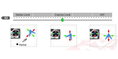 - modalita 2, permetterà al multirotore di dirigersi nella direzione imposta sul radiocomando, anche se il naso non coinciderà con quest’ultima, ma prendendo sempre come punto di riferimento il punto di partenza, pertanto non ha importanza conoscere la posizione del multirotore.