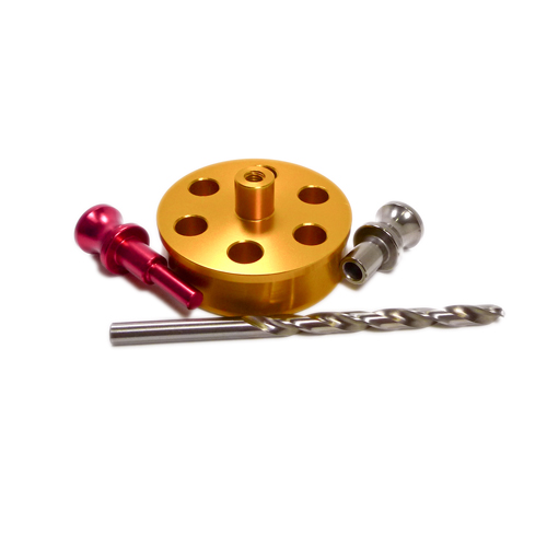 Prop drill jig for 6 bolt fixing comes with drill guide locking peg and drill bit.Hand held drill can be used as drill guide keeps drill straight no need for a pillar drill .