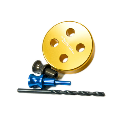 Prop drill jig for 4 bolt fixing comes with drill guide locking peg and drill bit.Hand held drill can be used as drill guide keeps drill straight no need for a pillar drill .