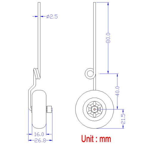 Gamba in acciaio armonico √∏ 2,5mm L= 120mm (senza ruota) completa di ruota in spugna √∏ 43mm DSR-30.