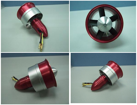 Tale soluzione oltre ad essere perfettamente equilibrata consente di trasmettere potenze molto più elevate a pari dimensione del motore e della ventola , tant'è che con questo gruppo EDF si ottengono spinte dell'ordine di 2200 gr. a seconda del motore instalalto e delle celle Lipo impiegate .
