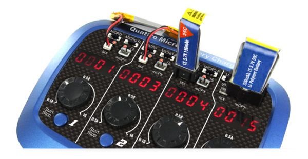 Il Quattro Micro Charger SkyRC è quindi la soluzione perfetta per la carica delle batterie dei micro elicotteri o micro aerei tipo E-Flite, essendo utilizzabile sia in casa collegandolo direttamente ad una presa 220V, sia al campo utilizzando la batteria 12V di un’automobile.