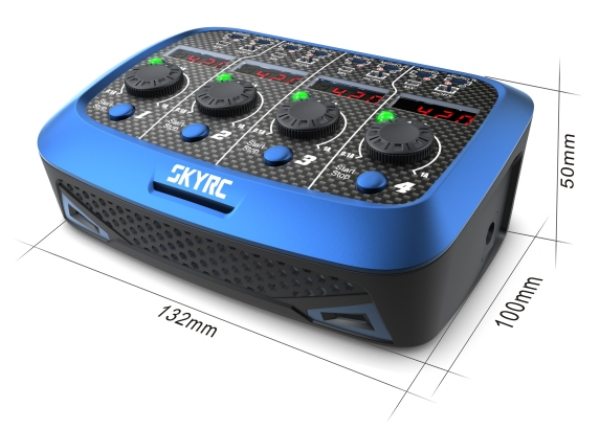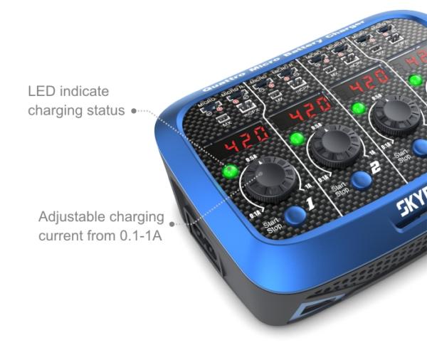 Il Quattro Micro Charger SkyRC è un carica batterie con doppia alimentazione 12/220V, in grado di caricare contemporaneamente 4 batterio Lipo 1S, con un range di carica tra 0,1 e 1,0A.