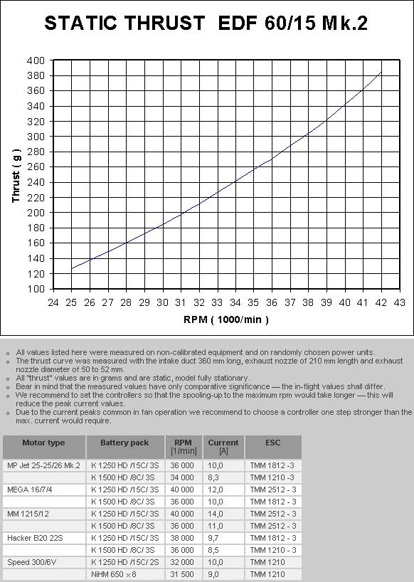 La ventola intubata EDF 60/15 Mk.2/MEGA prodotta da Alfa Model, è stata progettata per essere utilizzata specificatamente con il motore brushless ad alto numero di giri MEGA MOTOR 16/7/4 con cui si ottengono le migliori prestazioni in termini di spinta/correnti assorbite.Questa conbinazione è fortemente consigliata dalla stessa ALFA MODEL per la realizzazione del MIG 15 - F86 SABRE - FW TA 183 HUCKBEIN.Questa ventola può essere montata su modelli fino a 500 grammi di peso massimo, con una superficie alare di 12 - 15 dm2.Sui modelli a ventola intubata, il peso è un fattore importantissimo, molto di più che sui modelli ad elica; è pertanto fondamentale risparmiare ogni grammo in fase di realizzazione del modello.Il kit contiene tutto il necessario alla realizzazione della ventola intubata ed alla sua installazione.